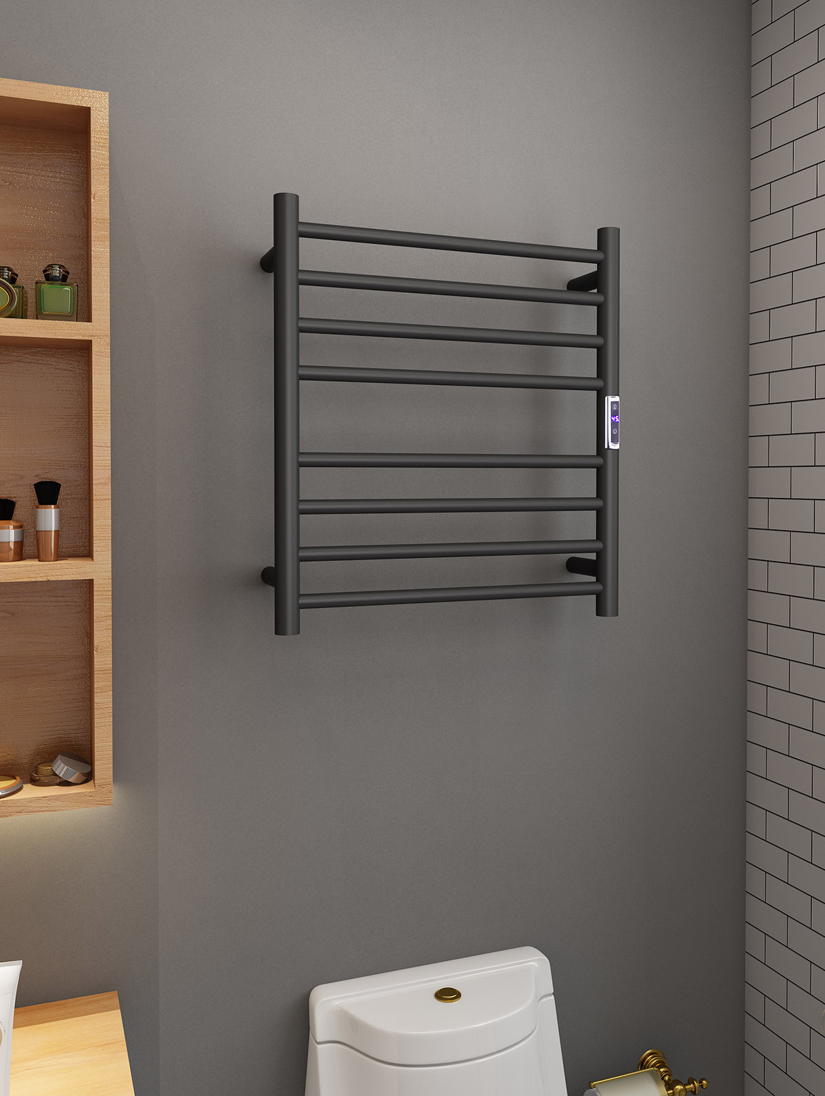 8桿時(shí)控開(kāi)關(guān)電熱毛巾架 8 bar time switch heated towel rail 材質(zhì)Material:SS201/SS304 功率Power:220V/130W 表面Surface:Black Painted 黑色噴塑 尺寸Size:550*110*650mm 包裝Ctn size:570*60*680mm