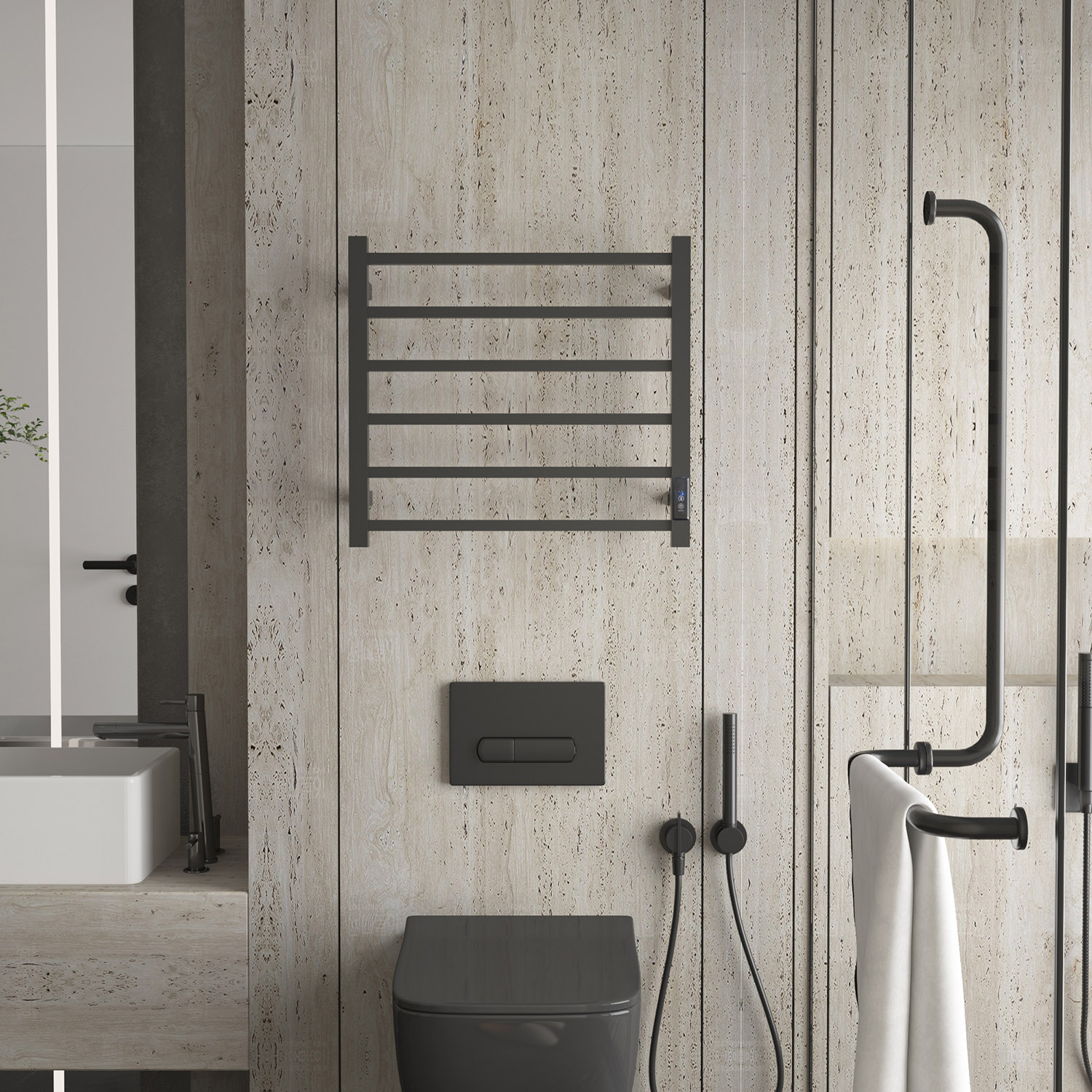 6桿時控溫控開關電熱毛巾架 6 bar time and temperature switch heated towel rail 材質Material:SS201/SS304 功率Power:220V/130W 表面Surface:Black Painted 黑色噴塑 尺寸Size:550*110*450mm 包裝Ctn size:570*60*480mm